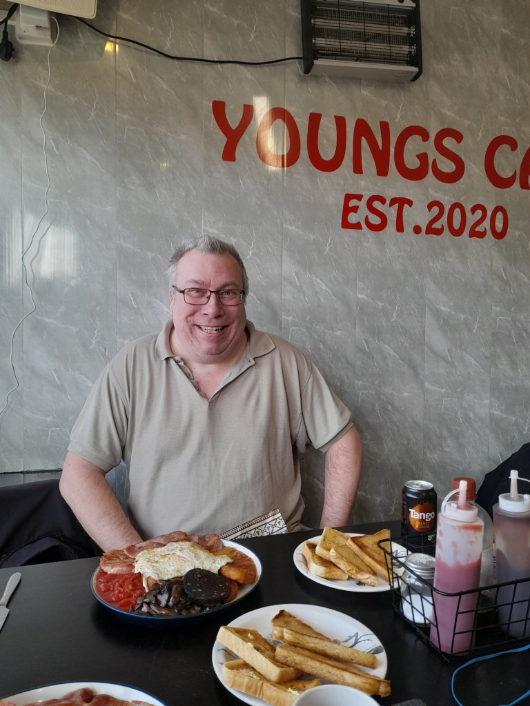 Back in the car and we needed a plan b. Craig didn’t want to go back the way we’d come due to some temporary traffic lights so we headed towards Portobello island. I knew there was a cafe on Pinfold Street in Darlaston which used to get mentioned regularly on Beacon Radio. I didn’t know it’s name so took advantage of another traffic delay to hit Google. Up came a cafe on The Green In Darlaston, which was showing as open until 1.30. We bombed it down The Keyway, and other than trying to direct Craig onto the Tesco carpark, it was a successful jaunt and we were soon strolling into Youngs Cafe.