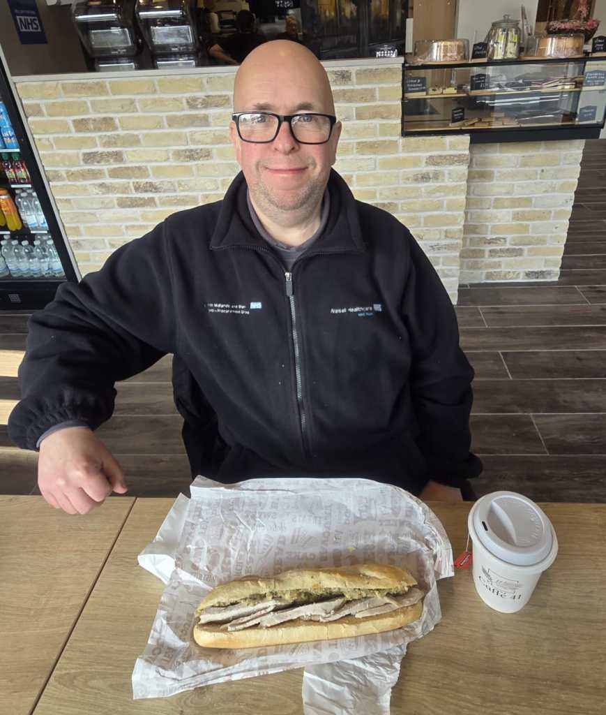I went for a chicken and stuffing baguette. This comes with 3 salad options, which I turned down quite quickly. I also went for an English Breakfast Tea, glad that didn’t stop at 12. Carole went for a cheese toastie. We got loyalty cards for the drinks, after a quick check with the 4th official to see if my tea qualified for one.