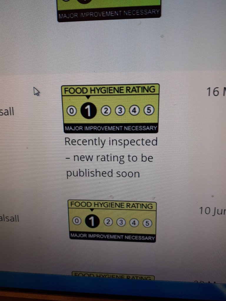 So where’s this leading? Well a couple of years ago I was going to visit all the 0 rated takeaways and do an article . As per usual though friends forced me to go to the pub on numerous occasions and I didn’t get round to it. But now I have a blog page and minimal content I thought I’d give it a whirl. I’m pleased to say that currently on the council website there isn’t a single place with a zero rating in Walsall. Well done everyone. So I’m doing the 1 star places instead. Bit healthier and I’ve enough zero’s in my life with some of the Walsall FC scores this season.