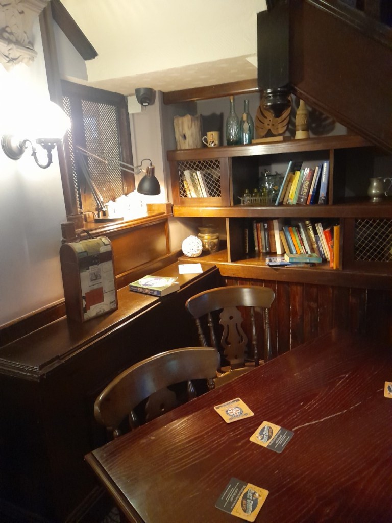 It was a bit lively upstairs so for the 2nd pint (blood orange cider after a green pint of Stonehenge Sign Of Spring) we headed for the part of the pub I call the Study. In here we found a joke book which Craig read from. I also chipped in with some of my favourite jokes like”a skeleton walks into a pub and says can I have a pint of lager and a mop please?”.