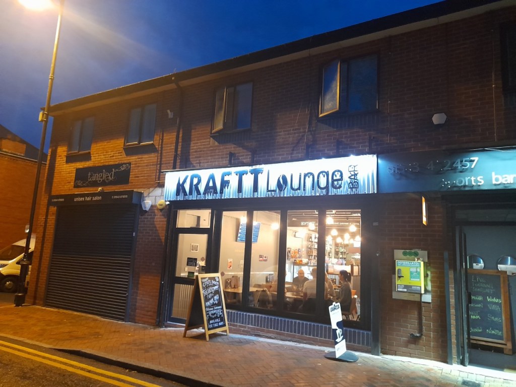 First port of call was Kraftt, a modern feeling bar in a former shop unit. The Song Of the Night Award was clearly in no mood to hang around with the epic Baby Fratelli by The Fratellis coming on as we approached the bar and no other tune that night came close to topping this. There was no ale on less than 5% with a epic sounding New Invention Brewery stout at 5.6% available. Now I needed a drink after the previous day’s news but it was a bit early for that. Last pint of the night and I’d have been all over it. We both opted for a 4% rhubarb cider.
