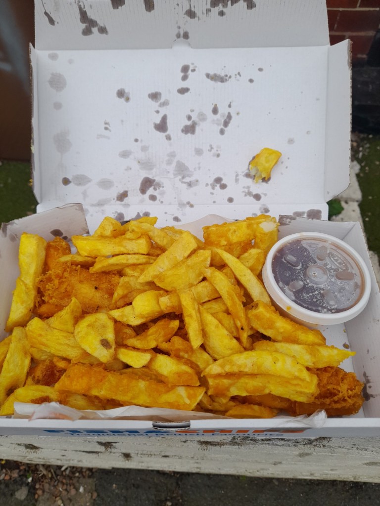Service was quick and very friendly. The package was quite hefty which made me glad I’d done a manual handling refresher course at work the previous week. The total was £10.80. The bundle was wrapped in 4 sheets of paper which brought back happy memories of playing Pass The Parcel as an 8 year old. Chips were ok but the fish was really good. Nice first visit to the place this one.