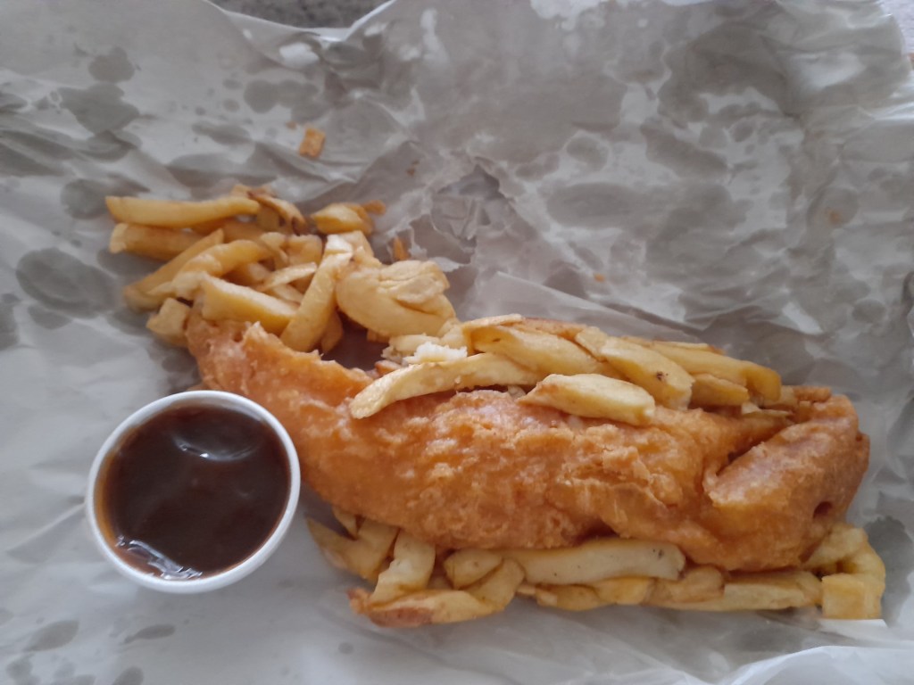 The fish and chips were both freshly cooked for us. Rob requested extra salt on his so the lady mentioned that she had marked mine with a star so I knew which was which. I liked this. I’ve not received a star since my school days. Actually that’s fake news. I was crap at school (no O levels Evo they call me), and I don’t recall ever earning a star at either of the shit holes I went to.