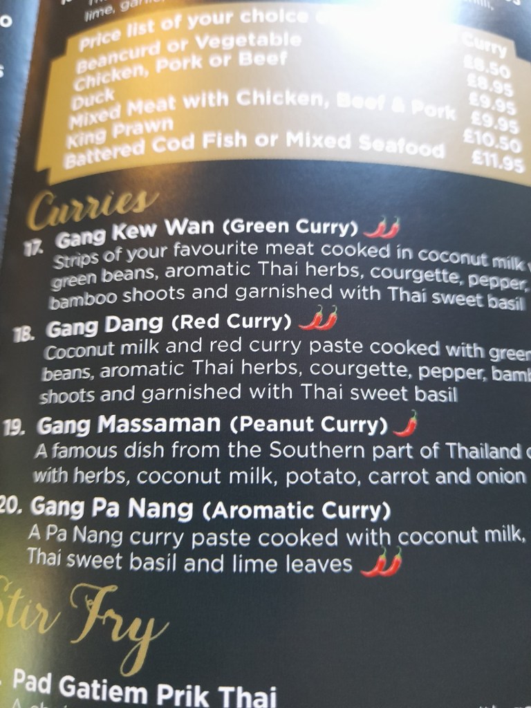 At the back of the pub is a Thai restaurant, complete with fish tank which brought back memories of the sadly missed Planet Spice in Walsall. Naturally I perused the menu.