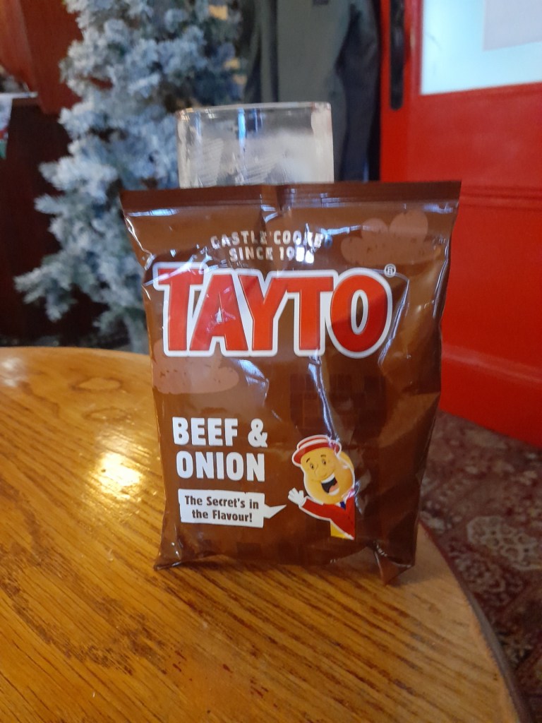 Chris had been on about beef and onion crisps all day and asking if I’d like some. I’d commented that it was highly unlikely as they’d been discontinued in 1980 (actually 1988 James found out). He then produced a pack from Ireland. I commented that you can’t smuggle your own crisps into pubs and that I wanted nothing to do with it for fear of being barred from everywhere in the vicinity under the Pelsall Pub Crisp Watch. I relented eventually.