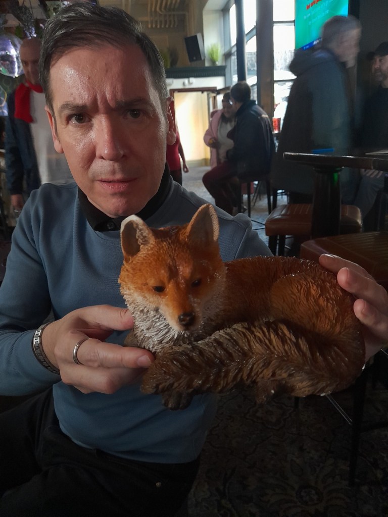Swill was now in full on Swill mode. He had been dancing around for a good 45 minutes and he rejoined us, just as a bloke I think was called Disco Dave sat at the table next to him. He then then produces a stone fox, and a half pint of water. He thinks dips his fingers in the water and flicks it over the fox. I think Swill got some too. The randomness levels were creeping up.